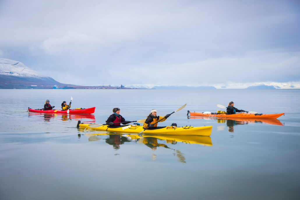 Join us for a kayaking trip in the beautiful Adventfjorden, surrounded by majestic mountains and untouched Arctic nature. The kayak allows you to glide silently over the water, finding a natural rhythm in your paddling. Some days, the fjord is mirror-like and calm; other times, small waves add an extra dimension to the experience. This tour is perfect for beginners looking for a safe and guided introduction to kayaking in the Arctic.